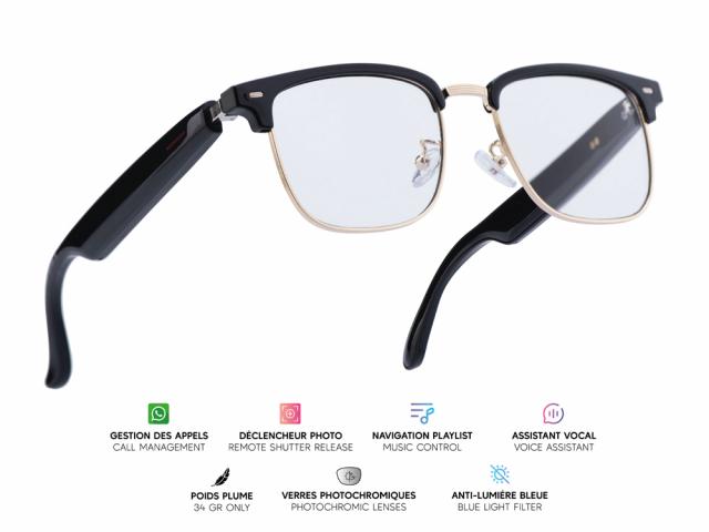 Lunettes connectées Mogie. - Modèle Vega - Branches noires avec cerclage doré et verres photochromiques