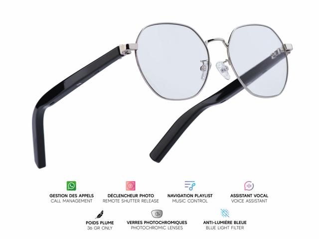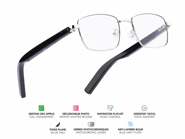 Lunettes connectées Mogie. - Modèle Nova - Branches noires avec cerclage argenté et verres photochromiques