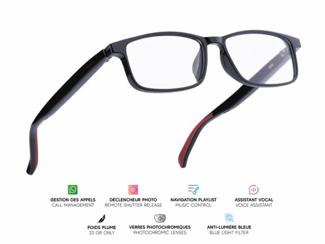 Lunettes connectées Mogie. - Modèle Lunor - Branches noires amovibles avec monture noire et verres photochromiques