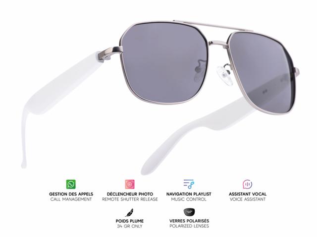 Lunettes connectées Mogie. - Modèle Thalos - Branches blanches avec monture argentée mate et verres solaires polarisés