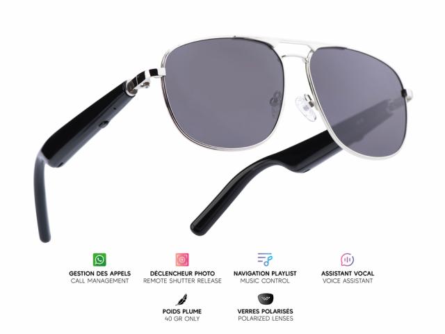 Lunettes connectées Mogie. - Modèle Nexis - Branches noires avec monture argentée et verres solaires polarisés