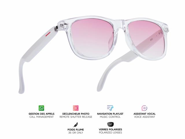 Lunettes connectées Mogie. - Modèle Dione - Branches blanches avec monture transparente et verres teintés rose