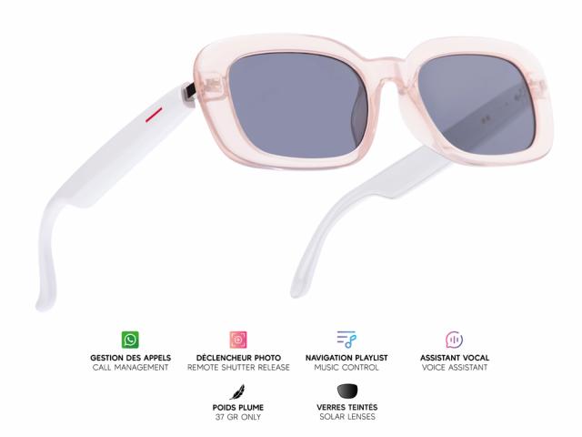 Lunettes connectées Mogie. - Modèle Mira - Branches blanches avec monture rose et verres solaires