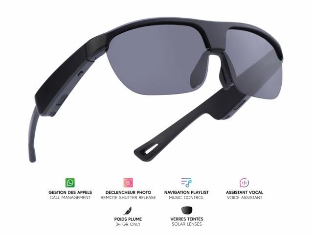 Lunettes connectées Mogie. - Modèle Eos - Branches noires avec monture noire et verres solaires polarisés
