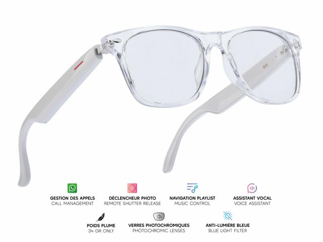 Lunettes connectées Mogie. - Modèle Sirius - Branches blanches avec monture transparente et verres photochromiques