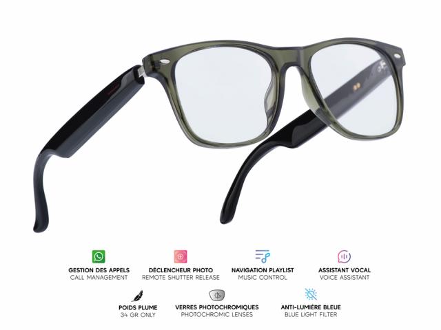 Lunettes connectées Mogie. - Modèle Sirius - Branches noires avec monture verte et verres photochromiques