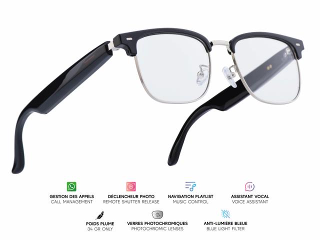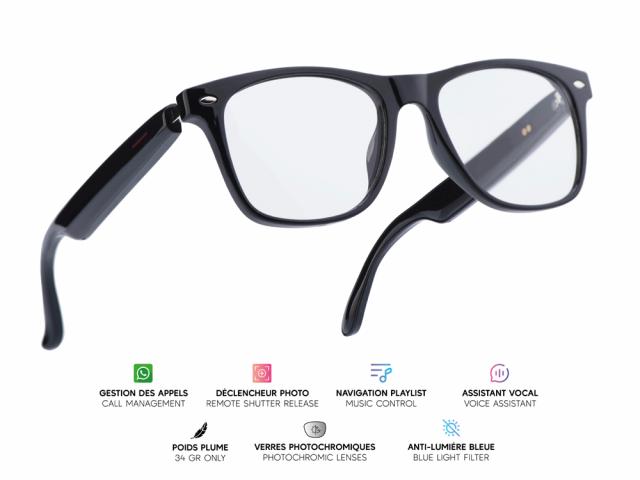 Lunettes connectées Mogie. - Modèle Lyra - Branches noires avec verres photochromiques
