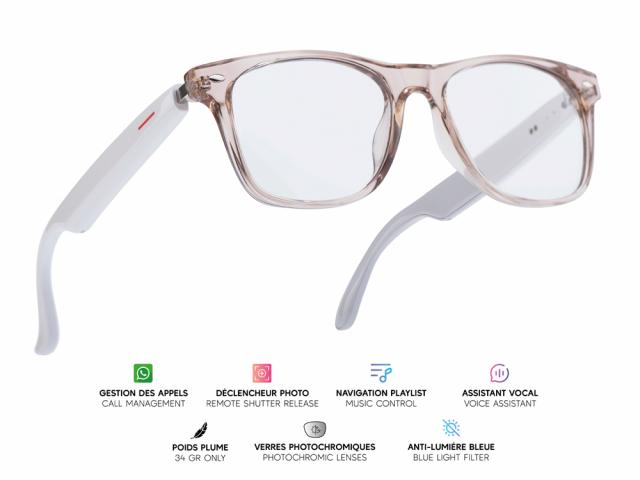 Lunettes connectées Mogie. - Modèle Sirius - Branches blanches avec monture champagne et verres photochromiques