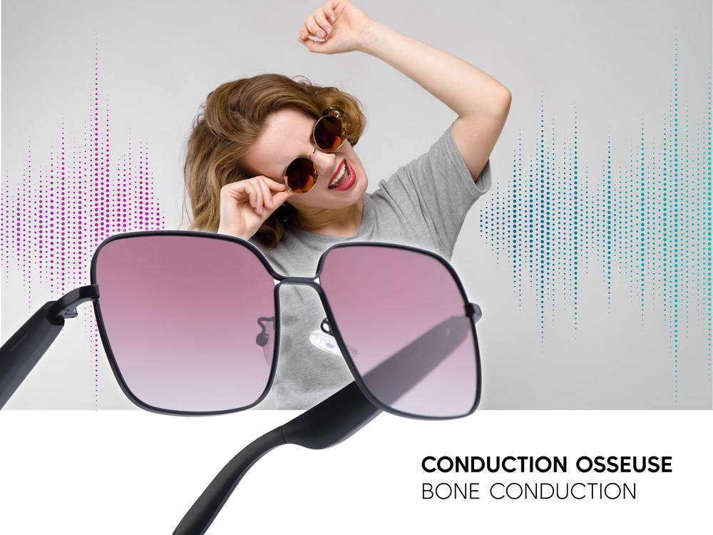 Profitez de votre playlist préférée grâce aux haut-parleurs intégrés à conduction osseuse. Un son clair, sans écouteurs, tout en restant attentif à votre environnement.